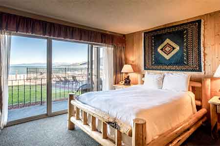 The rooms are furnished with classic pine log furnishings and décor for a warm rustic Tahoe experience. All rooms include gas fireplace, mini fridge, private balcony or patio overlooking Lake Tahoe, private bathroom with bathroom amenities and hair dryer. Single, double, triple or quadruple occupancy available.
